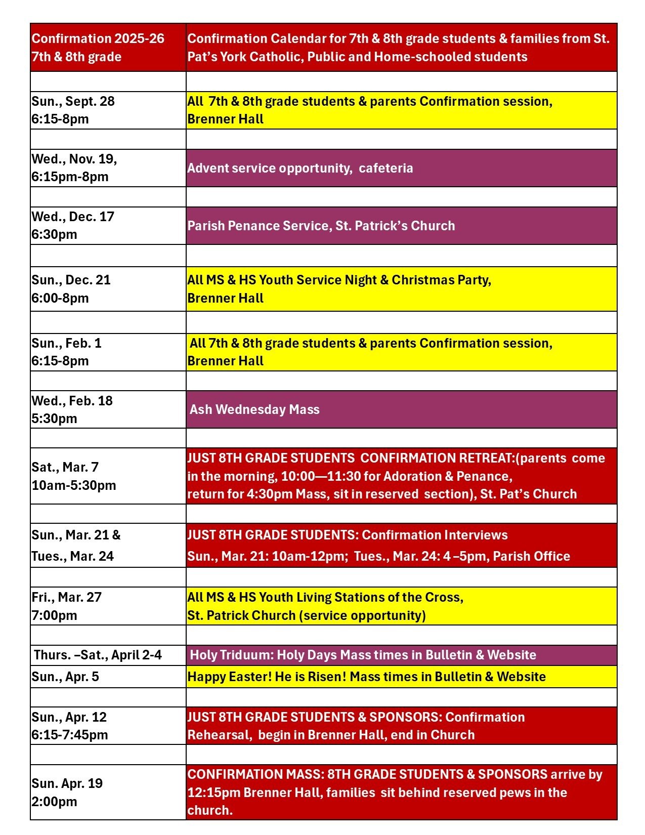All 7th & 8th Grade Confirmation parents – whose children attend York Catholic or Public Schools are expected to attend two Confirmation Parent & Student Sessions. A simple dinner will be provided: ~ after 5:30pm Mass– 6-8pm in Brenner Hall: Sun., Sept. 28, 2025, Sun., Feb. 1, 2026